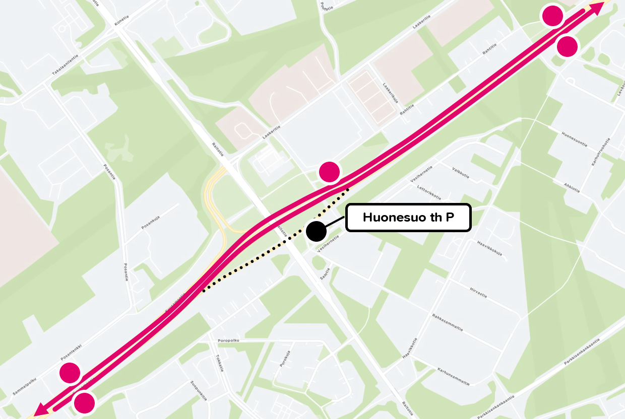 Huonesuo th P stop will be out of service daily from 7 PM to 6 AM starting Monday evening, 11 August.