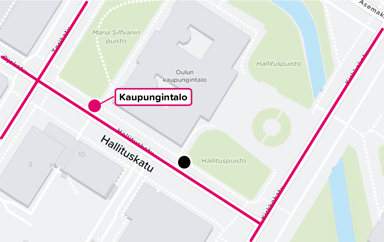 Kaupungintalo stop will be relocated on Hallituskatu from Tuesday, August 26. From then on, the stop will be located in front of Maria Silfvan Park, approximately 50 meters from its previous location.