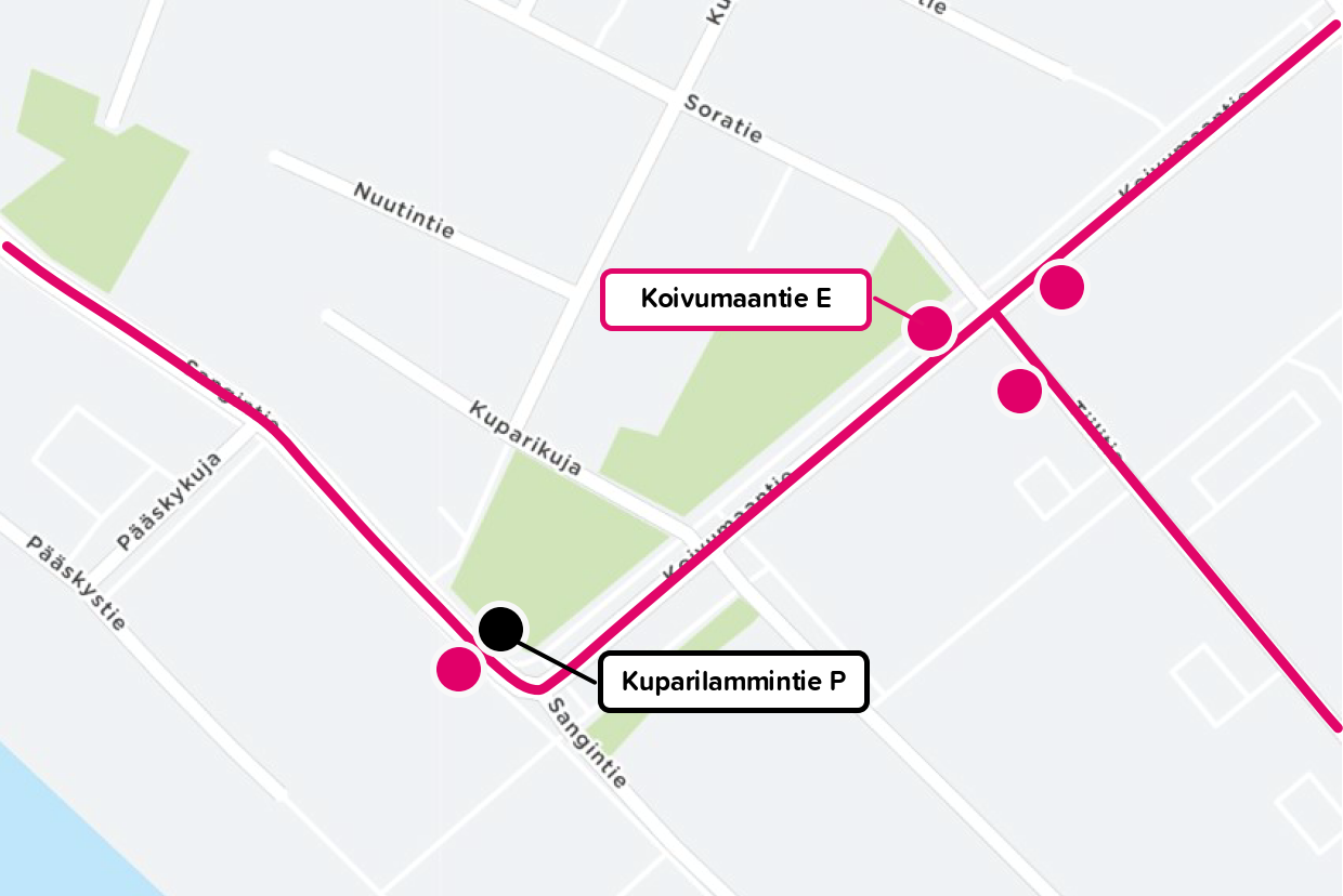 Kuparilammintie P stop will be temporarily out of service on Monday, August 18 from 7 AM. The nearby Koivumaantie E stop will serve as a replacement. The change is due to construction work and is expected to last for one day.
