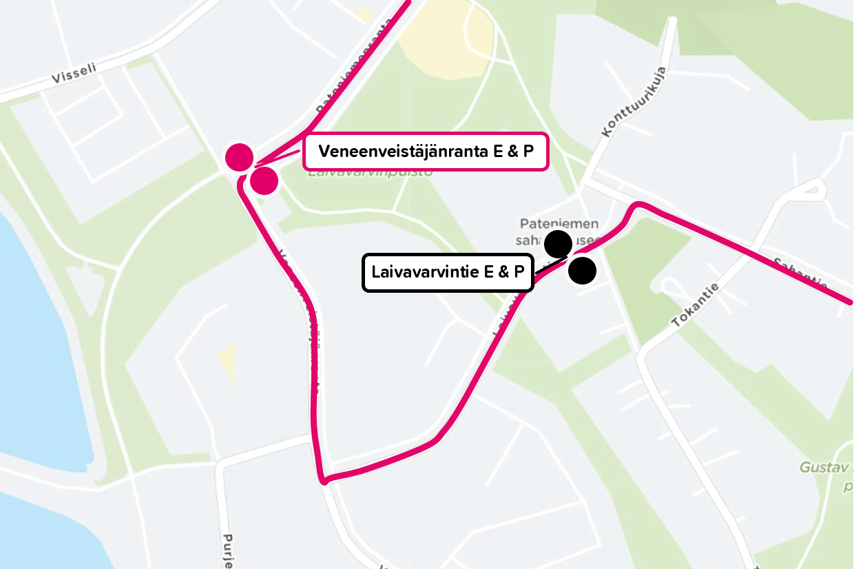 Laivavarvintie E and P stops will be temporarily out of service starting Thursday, August 21. The nearby Veneenveistäjänranta E and P stops will serve as a replacement. The change is due to construction work and is expected to last for approximately two weeks.