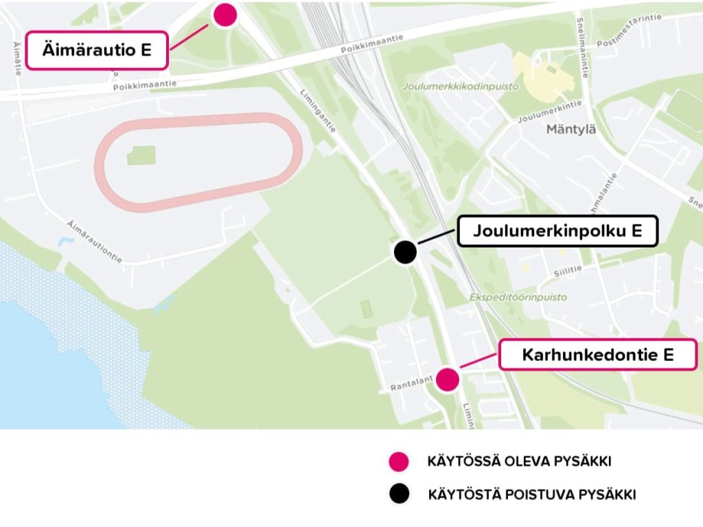 Joulumerkinpolku E -pysäkki on pois käytöstä keskiviikosta 15.4. alkaen. Korvaavina pysäkkeinä toimivat viereiset pysäkit Karhunkedontie E ja Äimärautio E.