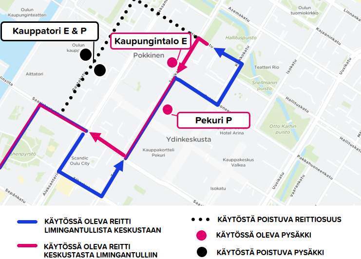 Poikkeusreitti ajetaan Limingantullista keskustaan:
